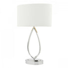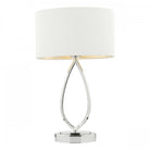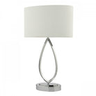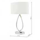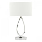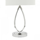 The Wyatt touch table lamp in polished chrome, is a tall lamp with an elegant teardrop shape outlined in diamond shaped metal work. Completed with an ivory linen and silver metallic lining. 3 stage touch operated, which makes this an ideal choice to use as a bedside light.