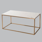 The Yarrow Coffee Table exudes contemporary elegance, crafted with a luxurious warm gold metal frame and a striking white marble top. Its sharp, straight design and brushed gold finish make it a stylish centerpiece for any modern or contemporary living space.