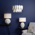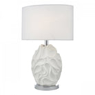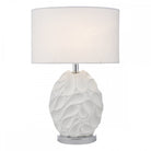 Zachary is a sculptured oval table lamp with a dramatic undulating texture with peaks and troughs balanced by the matt white painted finish, revealing subtle curved shadows. With bright polished chrome detailing at the base and neck, this lamp is paired with a complementary oval off-white linen shade.