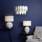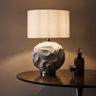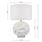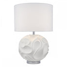 The Zachary table lamp with a dramatic undulating texture, balanced by the matte white finish, showing subtle curved shadows cast from the lamp above. Supplied complete with white linen shade and polished chrome detailing at the base and neck.