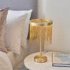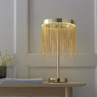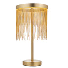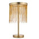 A beautiful table light finished in a satin brass effect plate. Delicate gold effect chains hang from a LED ring of light at differing lengths for a stunning shimmering effect.